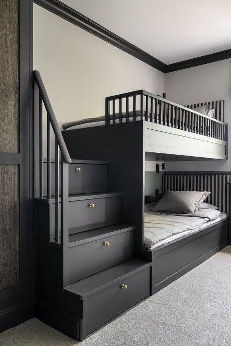 Our Dark Grey Luxury Bunk Bed Dubai — the most sophisticated bunk bed for sale in Dubai. Featuring a dark grey finish, brass-gold hardware, a wide storage staircase, and a striped accent headboard, this premium design suits teenagers and adults alike. Built to last with a 200kg-rated solid frame.