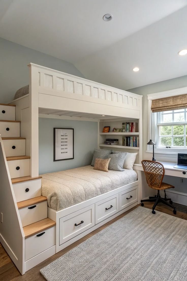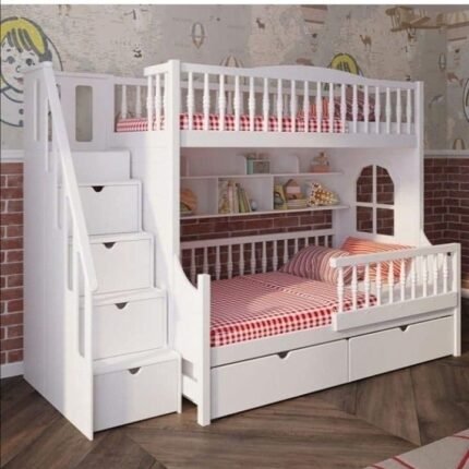 Our White Loft Bunk Bed with Desk Dubai is designed for school-age children in Dubai apartments. It features a wide staircase with storage steps, a built-in bookshelf beside the lower bunk, three under-bed drawers, and an upper loft sleeping area.