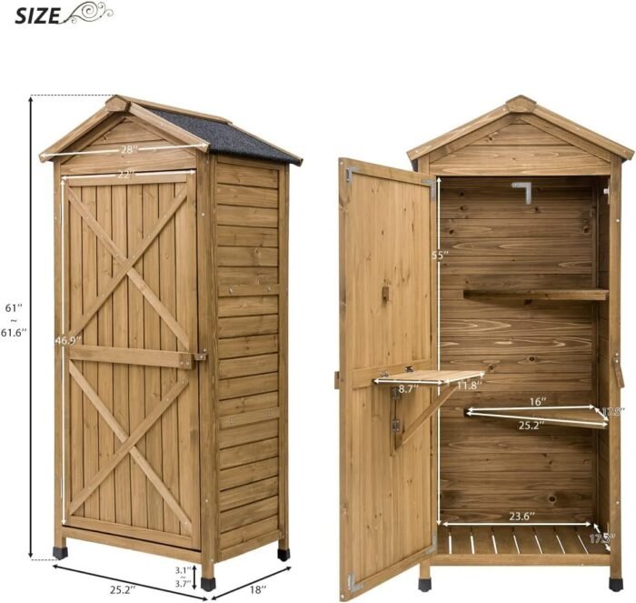 Maximize your outdoor storage with the Wooden Outdoor Garden Shed Lockers by DWW. Featuring a durable fir wood construction, a waterproof asphalt roof, and adjustable legs, this space-efficient shed is perfect for storing lawn mowers, garden hoses, tools, and more. A folding workstation adds functionality, while the sleek design enhances your outdoor space.