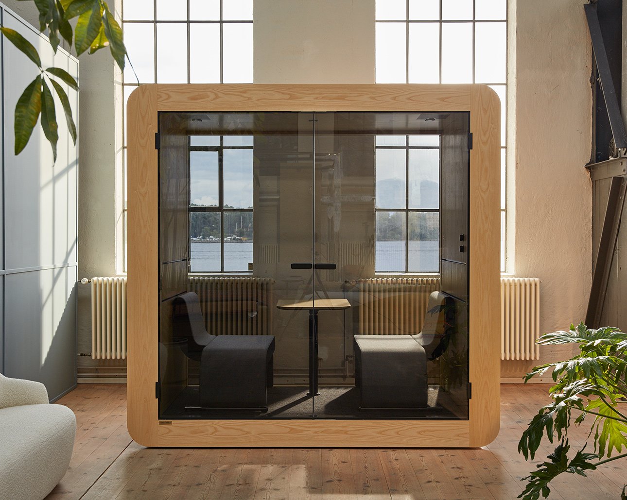 Comfortably fits up to 4 people for collaborative meetings, video calls, or private discussions. -
